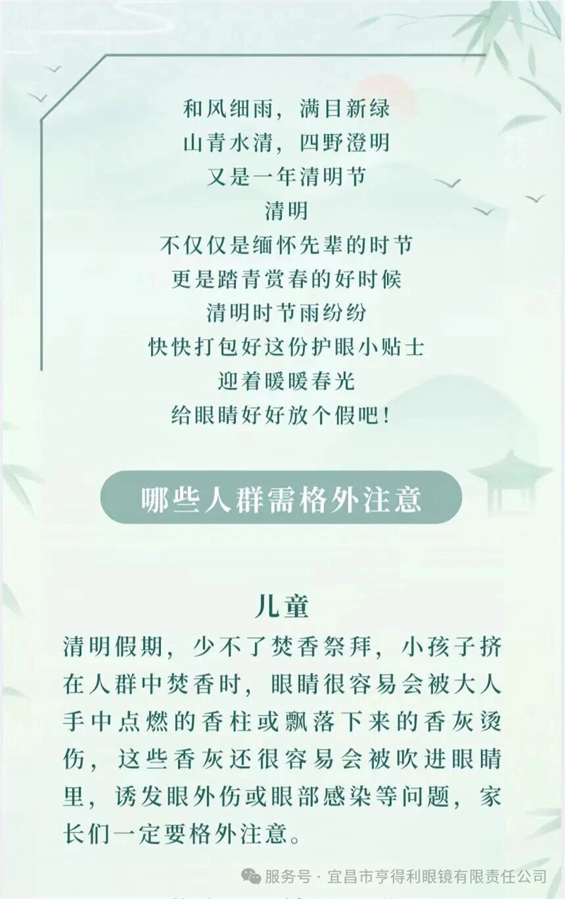 宜昌市亨得利眼鏡有限責(zé)任公司(70余年本地老字號)為你整理專屬護(hù)眼攻略,守護(hù)清明“睛”彩 。